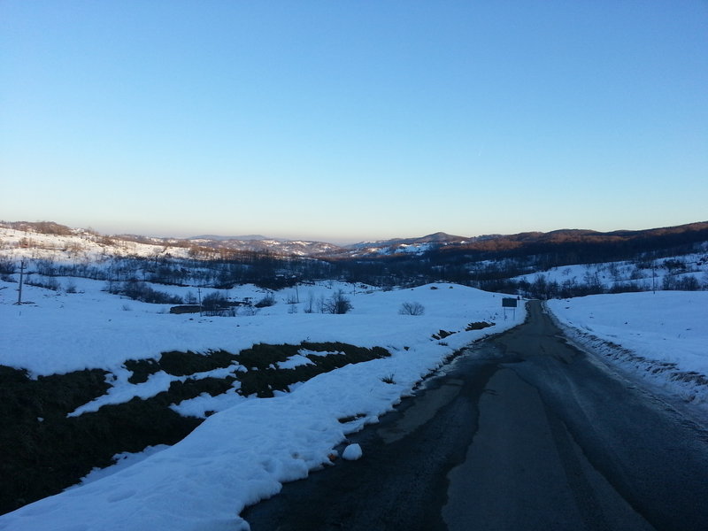 Si cele 5 minute in care am coborat au fost un adevarat cosmar, eram in treapta I de viteza, dar tineam masina si din frana de picior la limita la care s-ar fi putut opri motorul. Cu toate acestea in fata nu se aratau deloc lucruri frumoase, urmau 2 curbe pe care nu eram sigur ca reusim sa le luam, pentru ca atat in fagasurile rotilor, cat si in afara totul era acoperit de gheata.