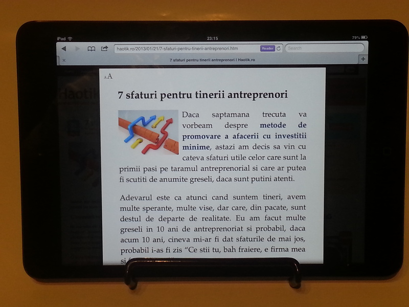 Apoi mi-a aratat cum se desparte tastatura in doua daca ai nevoie sa o tii cu ambele maini si sa poti ajunge pe laterale la toate tastele. O alta chestie super tare pe care mi-a aratat-o a fost cand a intrat pe blog si, printr-o apasare pe butonul „Reader”, a transformat articolul meu in ceva extraordinar de usor de citit, un fel de format ebook, daca ma intelegeti.